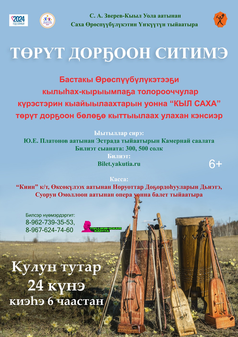 В целях пропаганды якутского инструмента кылыһах кырыымпы (со струнами из конских волос), поддержки традиционных и современных форм исполнительства на кылыһах кырыымпе, выявления и поддержки талантливых исполнителей, творческих коллективов, руководителей, повышения уровня исполнительского мастерства, обмена культурным опытом и развития творческих связей, развития творческого потенциала и повышения уровня профессионального мастерства педагогов и руководителей, стимулирования творческого потенциала детей, молодежи и взрослых Национальный театр танца РС(Я) им. С.А.Зверева-Кыыл Уола 24 марта 2024 г. проводит I-й Открытый конкурс исполнителей на кылыһах-кырыымпе,посвященный к 10-летию ансамбля якутской музыки «Кыл Саха». Конкурс начнется 24 марта в 10 часов в Камерном зале ГТЭ им. Ю.Е.Платонова и в этот день, на этой площадке в 18:00 часов состоится концерт победителей и участников конкурса.