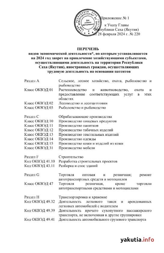 Sax (Yakutiya) Respublikasi rahbari tomonidan qabul qilingan qarorga muvofiq, Farmonda sanab o’tilgan faoliyat turlari bo’yicha respublika hududida faoliyat yurituvchi xo’jalik yurituvchi subyektlarga patentlar asosida mehnat faoliyatini amalga oshiruvchi xorijiy fuqarolarni jalb qilish taqiqlanadi.